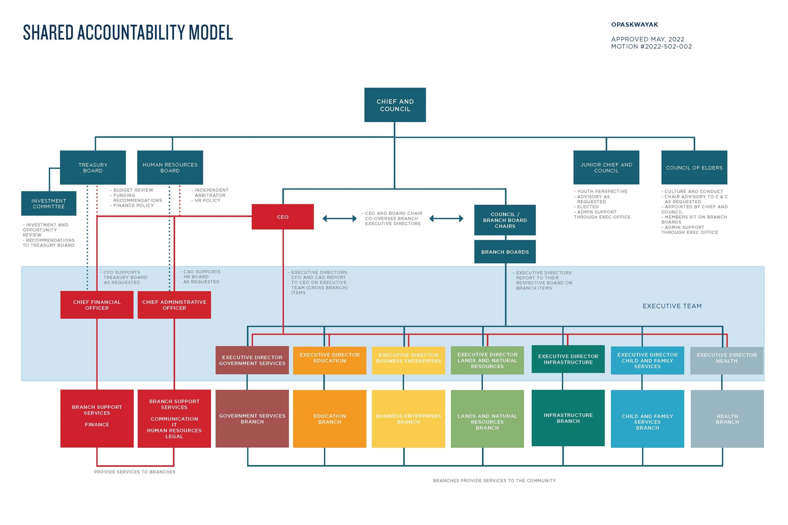 The organizational structure for Chief and Council, Councils, Boards, and Executive of Opaskwayak, approved May 2022