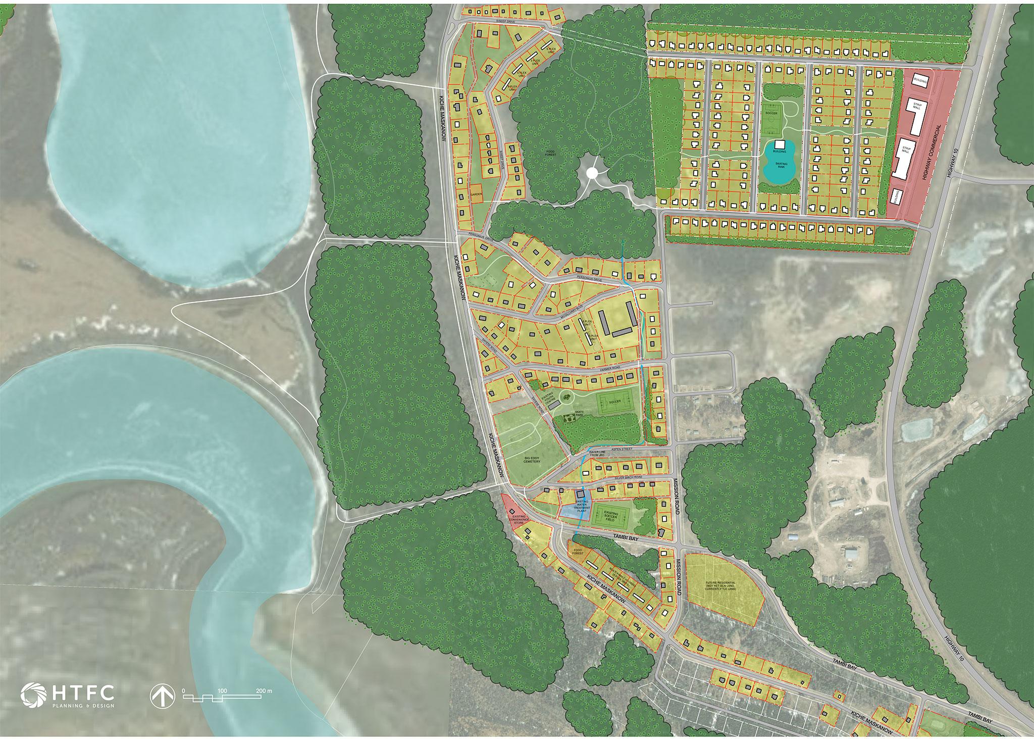 The new plan links the existing developed area of Big Eddy to Highway 10 with a new commercial area along the highway and, behind that, a residential subdivision, with housing organized around central community recreation space, including a pond that would turn into a skating area in winter.