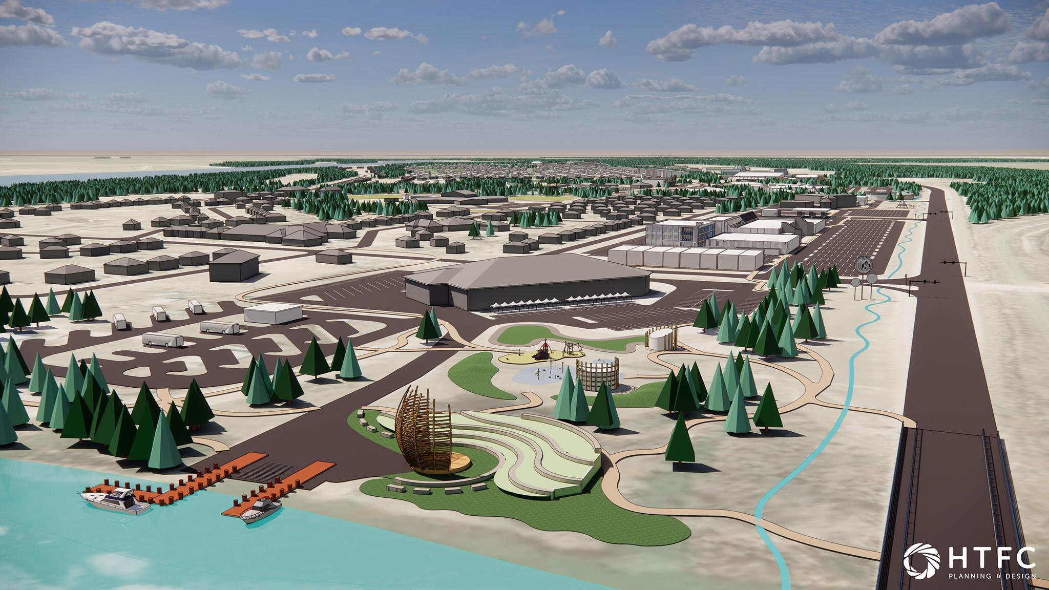 The public works yard will be relocated to the west of Amisk 2 off Kiche Maskanow, around the existing fire hall. Further to the northwest, the existing cemetery (which is nearing capacity) may be expanded and beautified with a small pond, which would help to control stormwater.