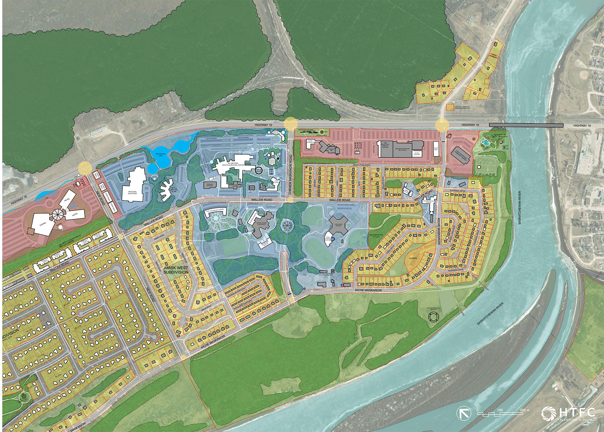 West of this, long-term plans would see the existing Aseneskak Casino relocated to make room for a new All Nations Health & Healing Centre. This health centre would serve the entire region and be a partnership between Opaskwayak, the Town of The Pas, and other parties based on successful models that are now being implemented across the country.