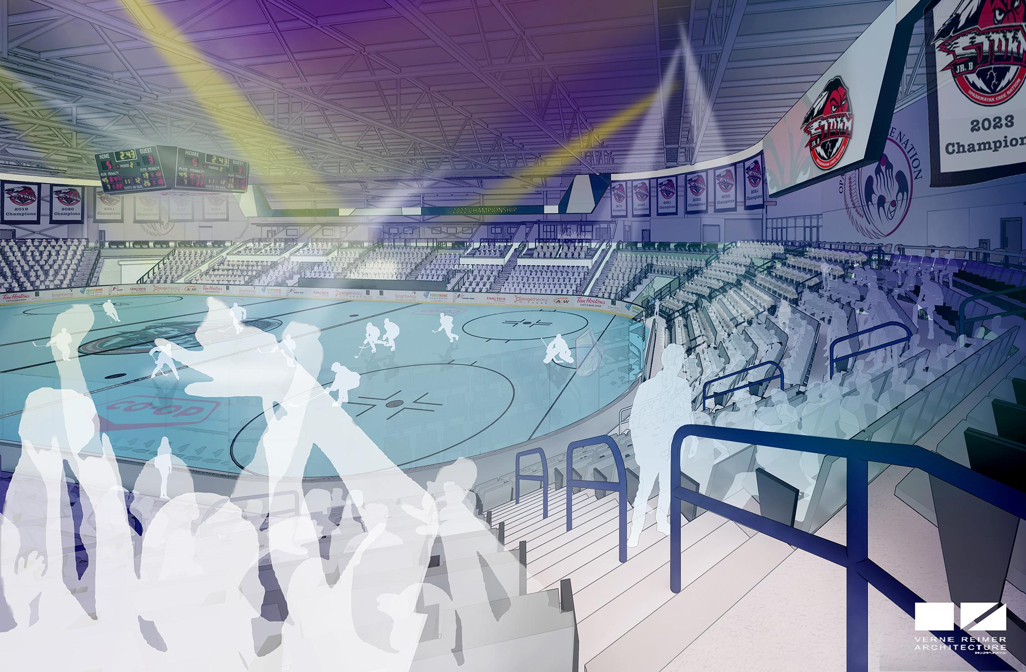 A new multiplex will replace the old Gordon Lathlin Memorial Centre and vastly expand the recreational facilities in the community. The multiplex, when built, could include an aquatic centre, a community space, a gym, indoor walking track, community care spaces, and two arenas. One of the arenas may be a spectator arena for the hockey team and one could serve as a practice arena. The rendering shows a view of how the multiplex spectator arena would look during a hockey game.
